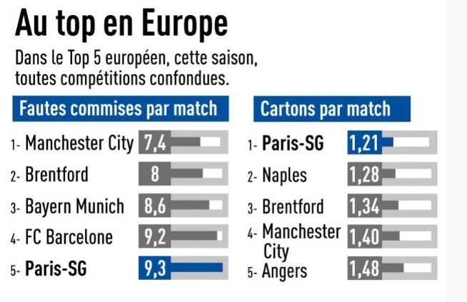 3月1日訊 法國媒體《隊(duì)報(bào)》對(duì)五大聯(lián)賽本賽季場(chǎng)均犯規(guī)次數(shù)和吃牌數(shù)最少的球隊(duì)進(jìn)行了統(tǒng)計(jì),其中巴黎圣日耳曼在兩項(xiàng)統(tǒng)計(jì)中都排在了前五名,具體如下: