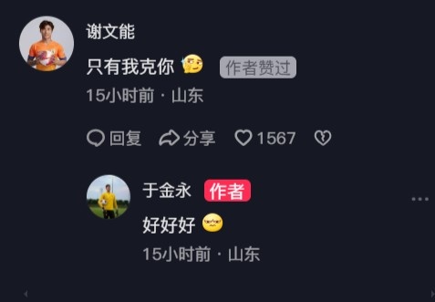 在評論區(qū),U20國足前鋒杜月徵與他互動,杜月徵評論道,你是真好,于金永則回復你最好。謝文能也出現在評論區(qū),他寫道:“只有我克你”,于金永則回復好好好。