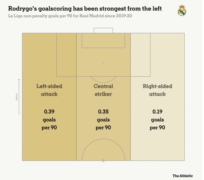 羅德里戈每90分鐘在左路0.39球,中路0.35球,右路0.19球