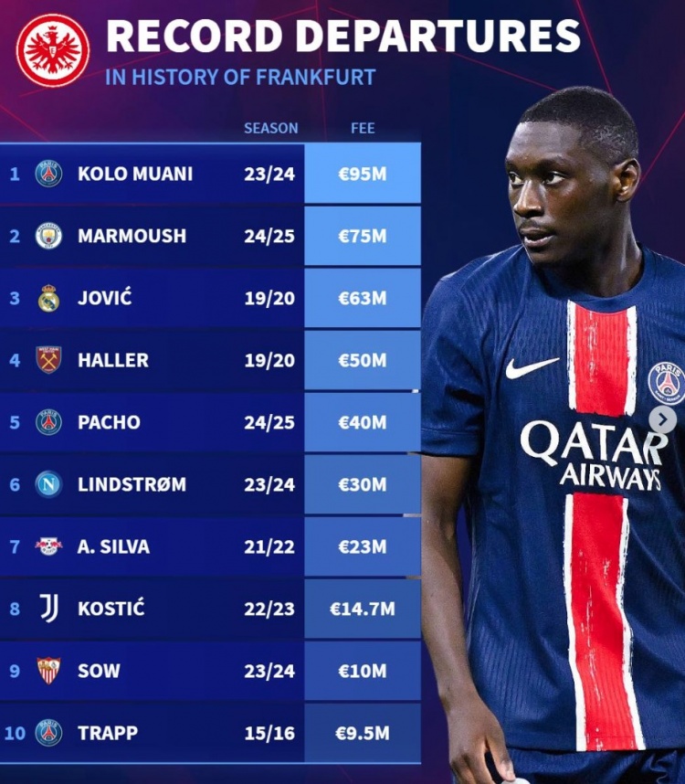 德轉(zhuǎn)列法蘭克福隊(duì)史賣人榜:歐元