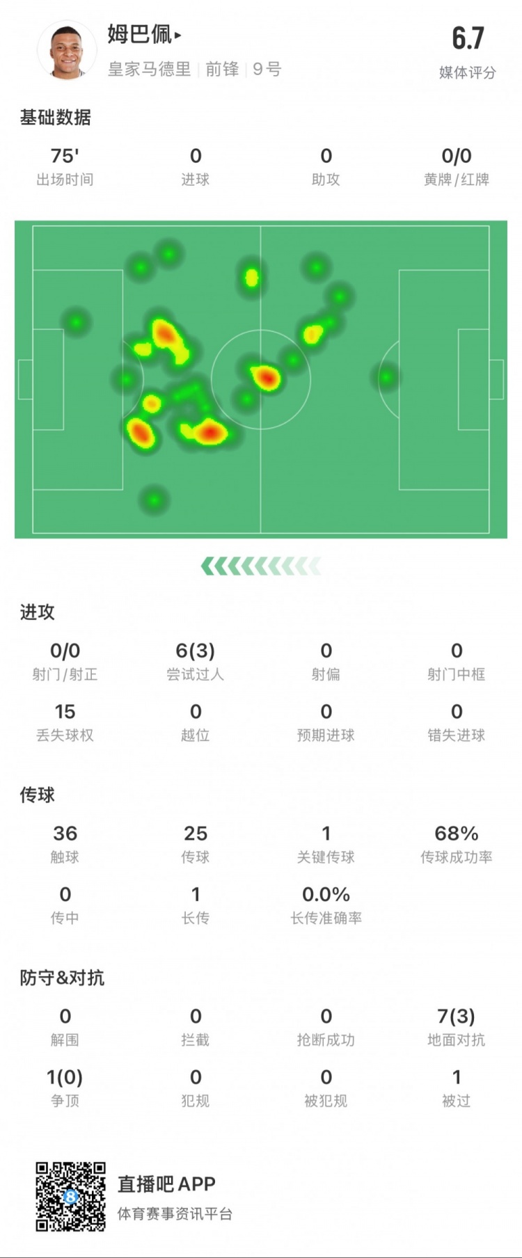 姆巴佩本場數(shù)據(jù):0射門,3次成功過人,1次關(guān)鍵傳球