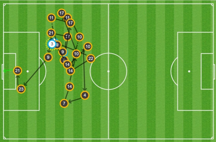 據(jù)統(tǒng)計,這粒進(jìn)球經(jīng)過了皇馬球員19次連續(xù)傳球后打進(jìn)。在皇馬本賽季西甲所有客場進(jìn)球中,這是皇馬進(jìn)球前傳遞次數(shù)最多的一粒進(jìn)球。