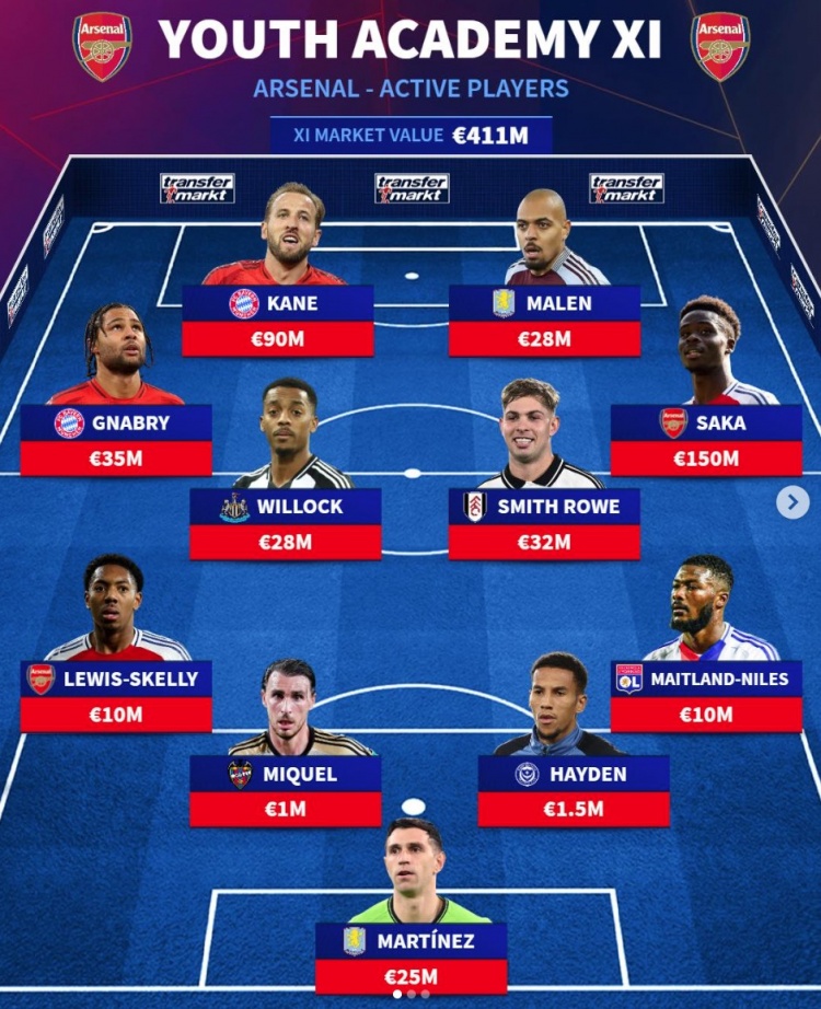 阿森納青訓(xùn)當(dāng)前最貴陣:總身價4.11億歐元