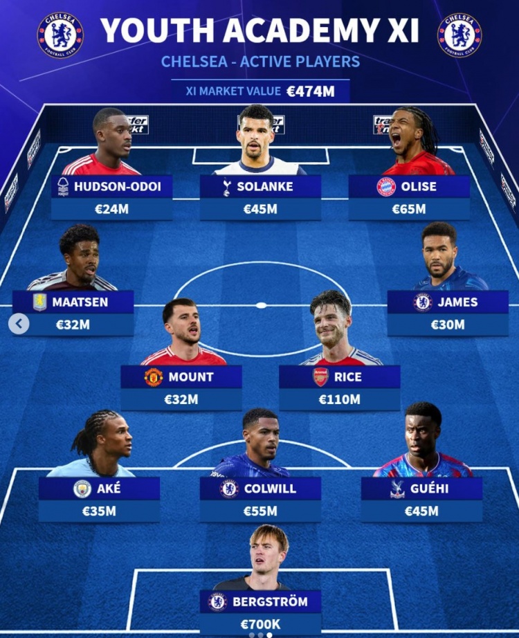 切爾西青訓(xùn)當(dāng)前身價最貴陣:總身價4.74億歐元