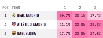 皇馬最新西甲奪冠概率28.1%,西甲三強(qiáng)中最低