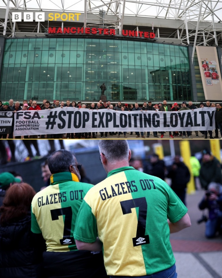 比賽開始前,兩隊球迷在老特拉福德球場前進(jìn)行了聯(lián)合抗議活動,拉出了寫有“停止剝削忠誠”的橫幅。此外,也有部分曼聯(lián)球迷仍在堅持表達(dá)對格雷澤家族的不滿,他們穿上了印有“格雷澤滾蛋”的球衣。