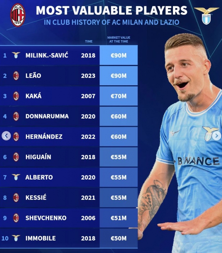 3月3日訊 米蘭將在本輪意甲焦點(diǎn)戰(zhàn)主場(chǎng)迎戰(zhàn)拉齊奧,《轉(zhuǎn)會(huì)市場(chǎng)》也列出了兩隊(duì)歷史德轉(zhuǎn)身價(jià)最貴榜單。