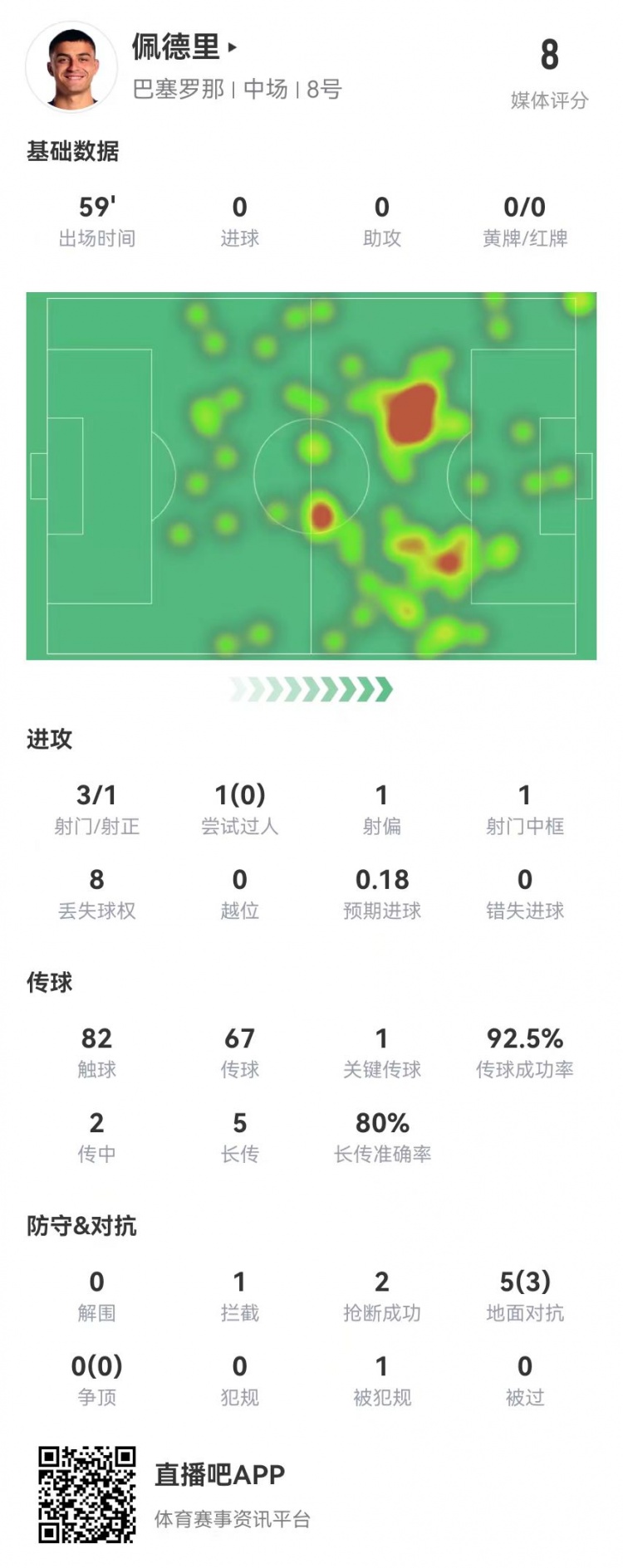 佩德里本場3射1中框 5長傳4成功 1關(guān)鍵傳球+2搶斷 獲評8.0分