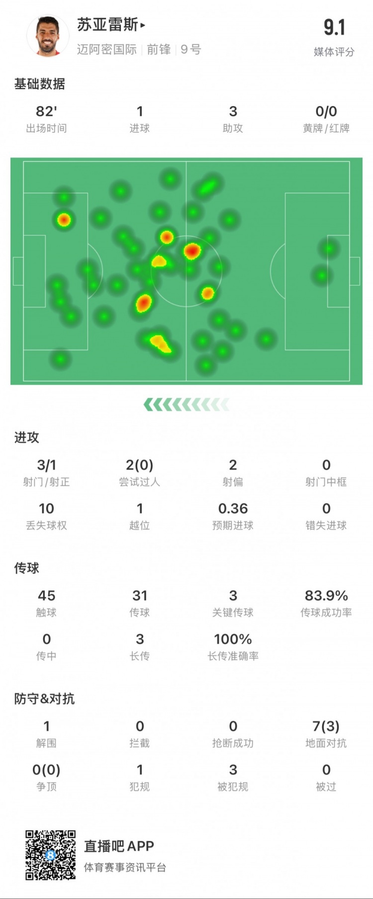 3月3日訊 美職聯(lián)常規(guī)賽,邁阿密?chē)?guó)際對(duì)陣休斯頓迪納摩,蘇亞雷斯本場(chǎng)數(shù)據(jù):