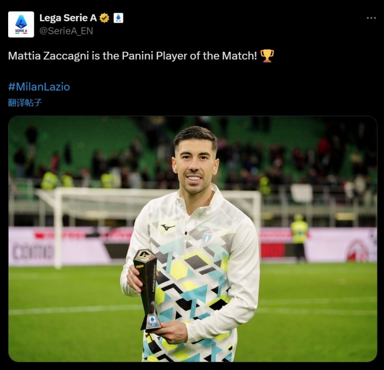 首開(kāi)記錄!意甲官方:扎卡尼當(dāng)選米蘭vs拉齊奧全場(chǎng)最佳球員