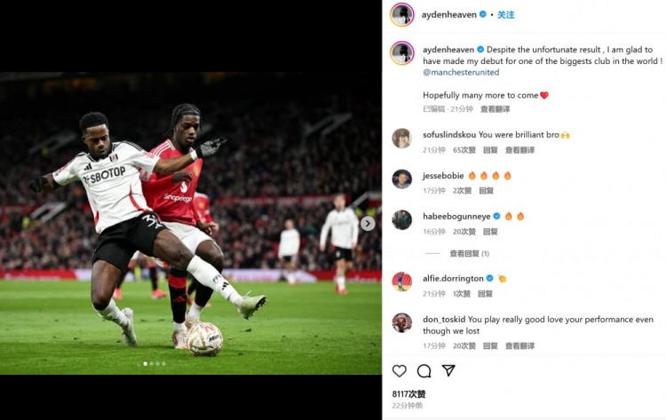 他也在賽后通過社媒曬出自己的比賽照,并配文:“盡管結(jié)果并不理想,但我很高興能夠?yàn)檫@家世界最大俱樂部之一完成首秀。@曼徹斯特聯(lián)俱樂部,希望未來能夠有更多出場(chǎng)機(jī)會(huì)?!?/p>
