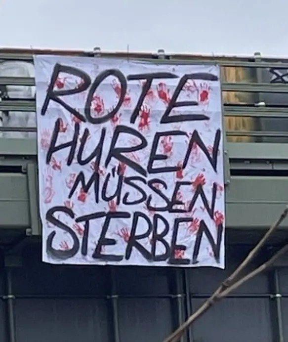 慕尼黑1860球迷在不久前懸掛橫幅嘲諷拜仁,而近日慕尼黑多地出現(xiàn)了針對拜仁更具侮辱性的口號和標(biāo)識。在一棟大橋上出現(xiàn)了寫有“紅色妓女必須死”的橫幅,橫幅上還印有紅色掌印,可能是為了象征血跡。而在塞貝納街區(qū)附近,多個(gè)電箱被1860球迷涂鴉上象征慕尼黑1860的藍(lán)色油漆,此外還用紅色油漆寫了“125年的婊子”、“紅色妓女”等仇恨信息。