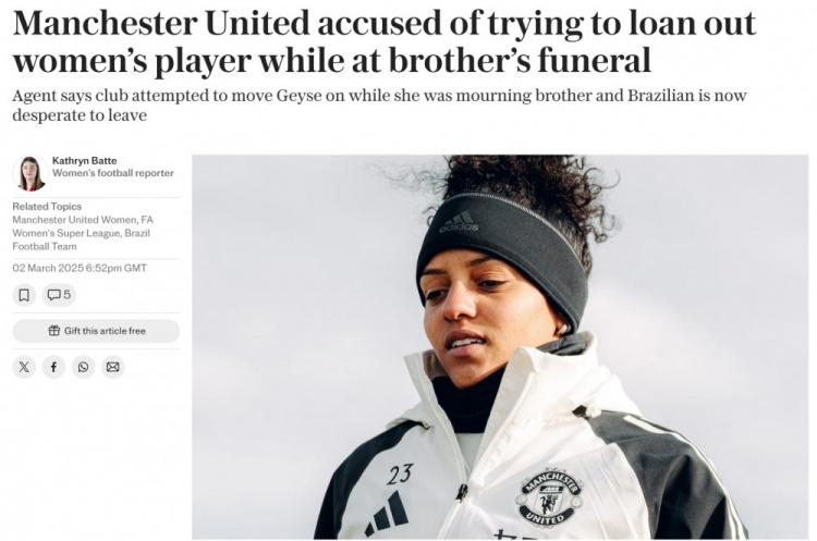 巴西女足球員蓋斯在2023年以創(chuàng)紀(jì)錄的轉(zhuǎn)會(huì)費(fèi)從巴塞羅那轉(zhuǎn)會(huì)曼聯(lián),但現(xiàn)在,她在俱樂部過得并不開心,想要離開。蓋斯的經(jīng)紀(jì)人路易斯-費(fèi)利佩-席爾瓦告訴《電訊報(bào)》,球員在一月份回巴西參加去世哥哥的葬禮時(shí),曼聯(lián)曾試圖將她租借到美國(guó)的俱樂部。
