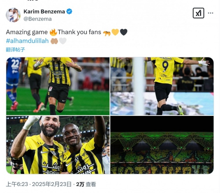 20場18球7助!本澤馬社媒慶祝戰(zhàn)勝新月:精彩的比賽,感謝球迷