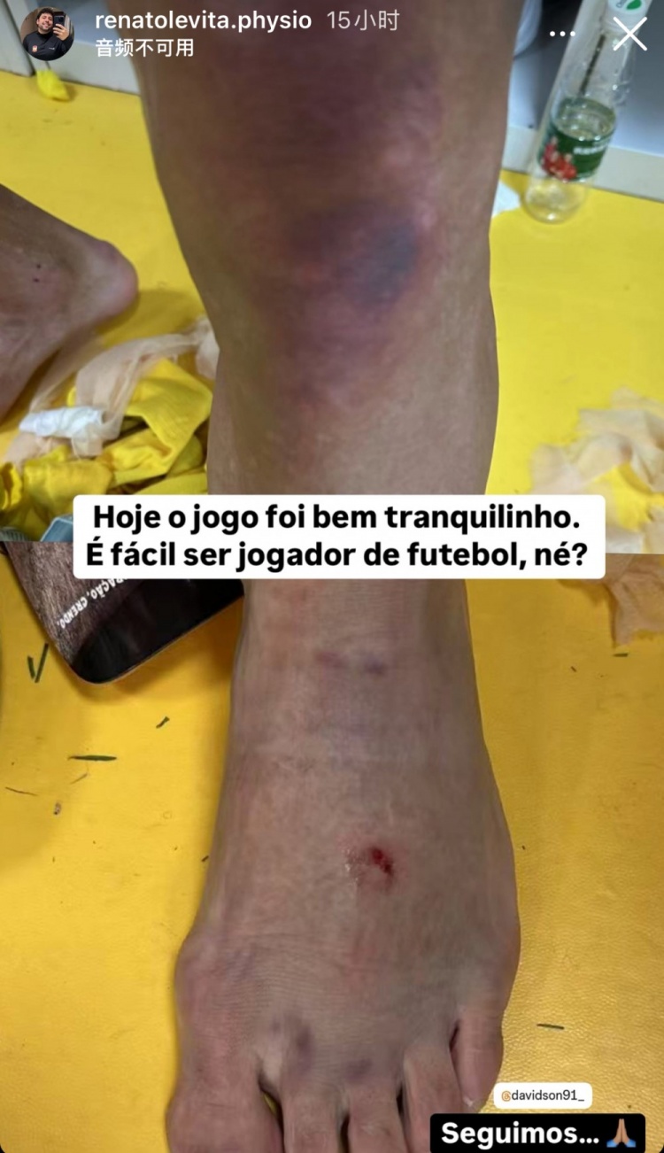 本場比賽戴維森打滿全場,作為西海岸核心球員的他,自然也得到了三鎮(zhèn)隊的重點“關(guān)照”。從西海岸理療師社媒曬出的照片可以看到,一場比賽下來,戴維森的腿部已是傷痕累累,西海岸理療師為此配文寫道:“一場平靜的比賽。當足球運動員很容易,對吧?”