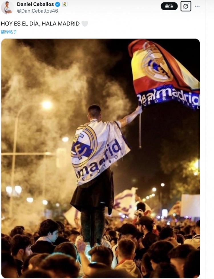 皇馬中場塞巴略斯更新社媒,曬出了一張身披皇馬隊旗的海報,并配文寫道:“就在今天,加油皇馬!”