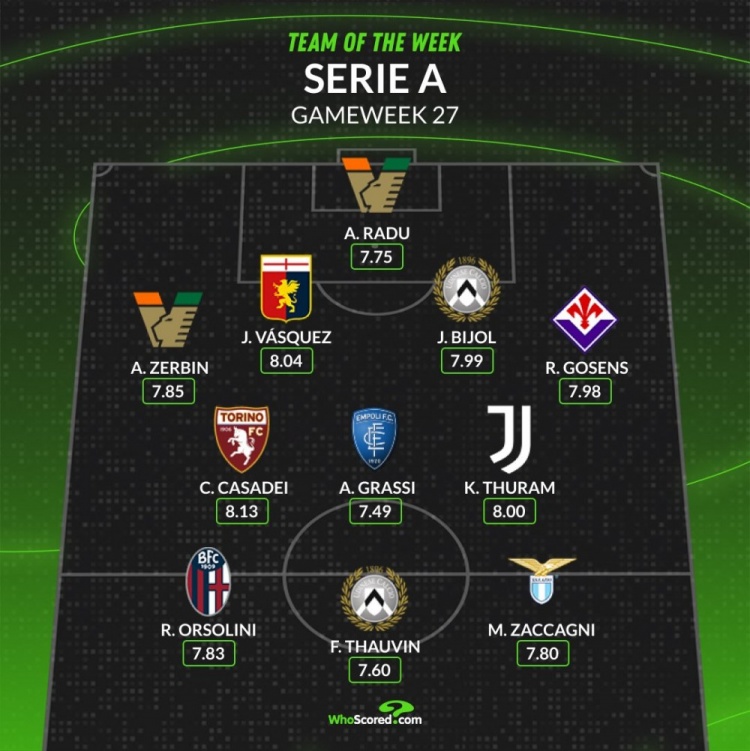 后衛(wèi):澤爾賓(威尼斯,7.85分)、約翰-巴斯克斯(熱那亞,8.04分)、比約爾(烏迪內(nèi)斯,7.99分)、戈森斯(佛羅倫薩,7.98分)