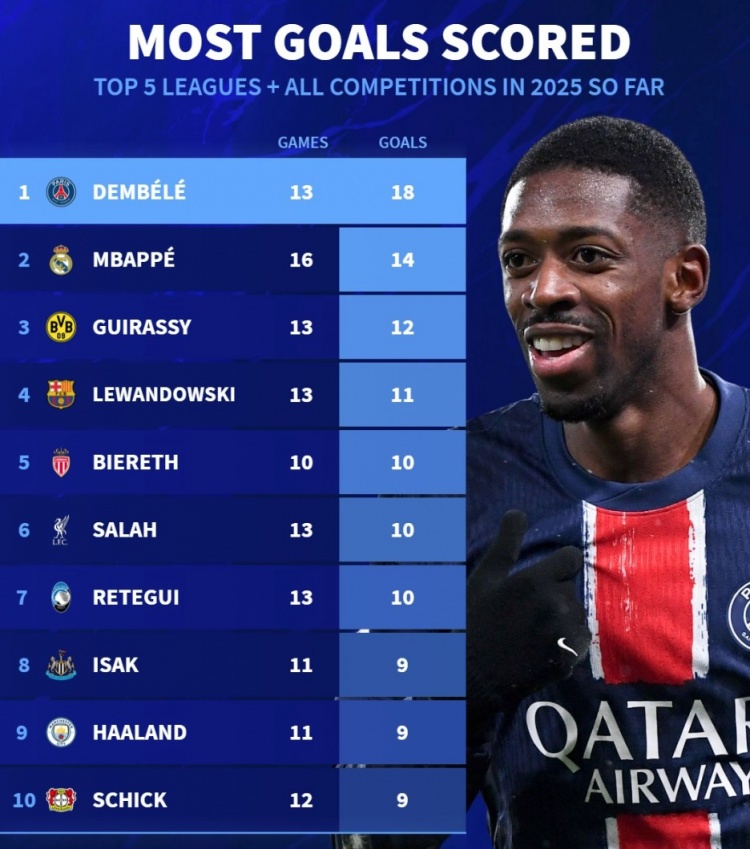 3月4日訊 《轉(zhuǎn)會(huì)市場(chǎng)》統(tǒng)計(jì)了2025年五大聯(lián)賽球員各項(xiàng)賽事進(jìn)球情況,登貝萊居首。