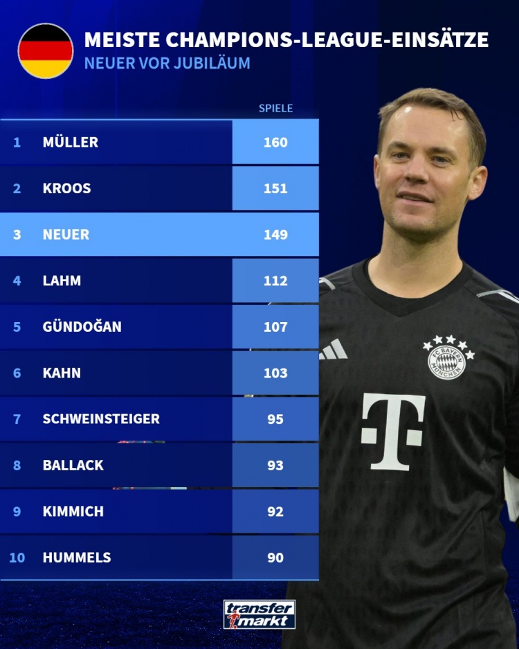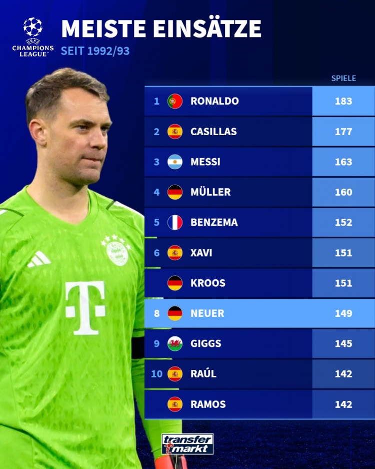 目前,諾伊爾是歐冠出場第三多的德國球員,也在歐冠歷史出場次數(shù)榜中排名第8。