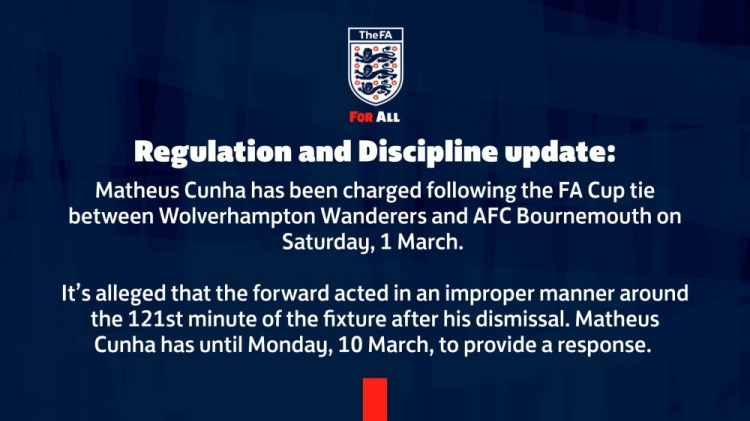 英足總官方表示:“在3月1日足總杯狼隊對陣伯恩茅斯的比賽之后,對庫尼亞提出指控,這位前鋒在被罰下后行為不當(dāng),他必須在3月10日周一之前做出回應(yīng)?!?/p>