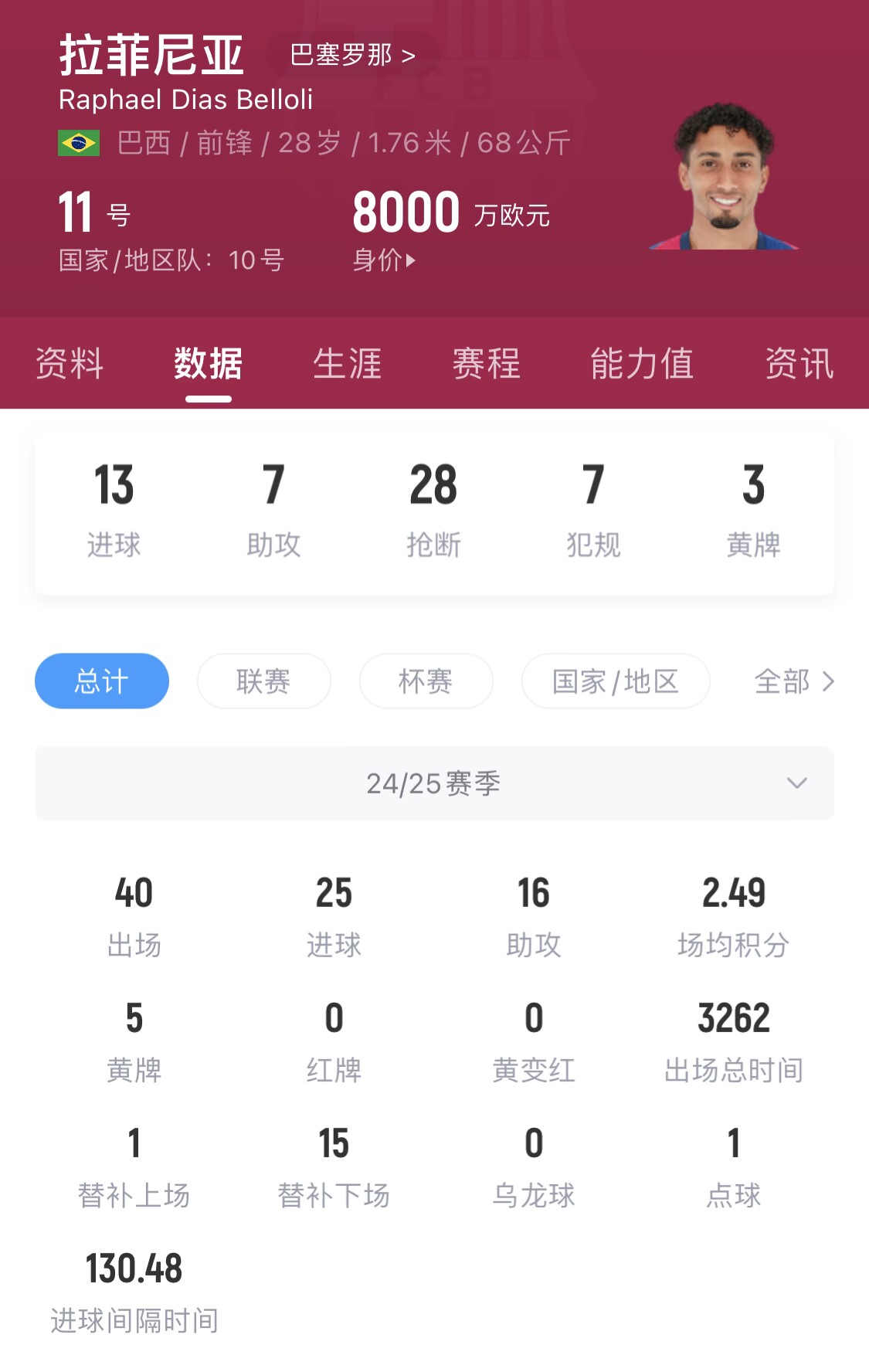 28歲的巴西前鋒目前身價8000萬歐,本賽季至今40場比賽25球16助。