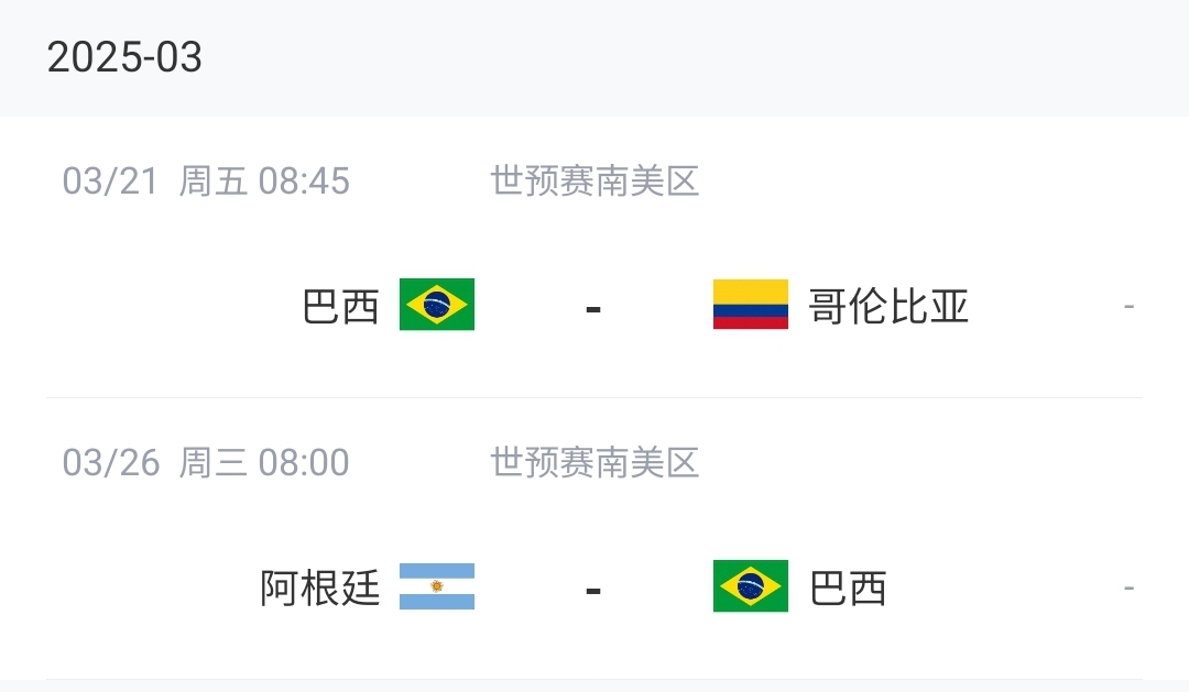 在3月份的世預(yù)賽中,巴西將先后交手哥倫比亞和阿根廷,目前巴西隊(duì)5勝3平4負(fù)積18分,位列第5。