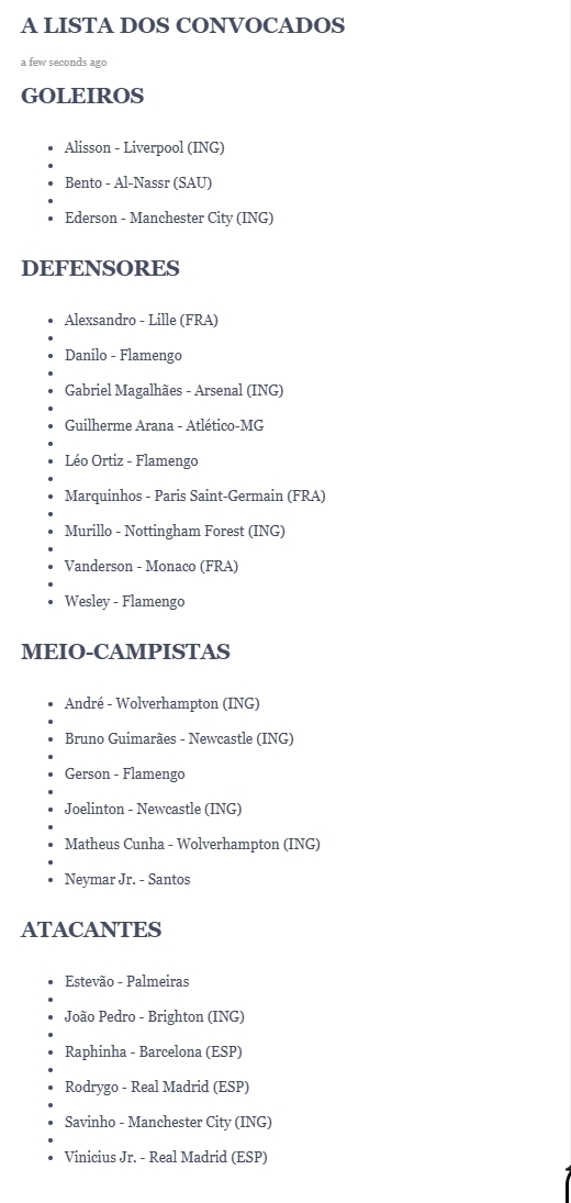 維尼修斯(皇馬)、羅德里戈(皇馬)、拉菲尼亞(巴薩)、恩德里克(皇馬)、馬丁內(nèi)利(阿森納)、薩維尼奧(曼城)、利諾(馬競(jìng))、安東尼(貝蒂斯)、若昂-佩德羅(布萊頓)、布魯諾-恩里克(弗拉門戈)、伊戈?duì)?熱蘇斯(博塔弗戈)、路易斯-恩里克(澤尼特)、埃斯特旺(帕爾梅拉斯)、加萊諾(吉達(dá)國(guó)民)、派尚(費(fèi)耶諾德)、尤里-阿爾貝托(科林蒂安)