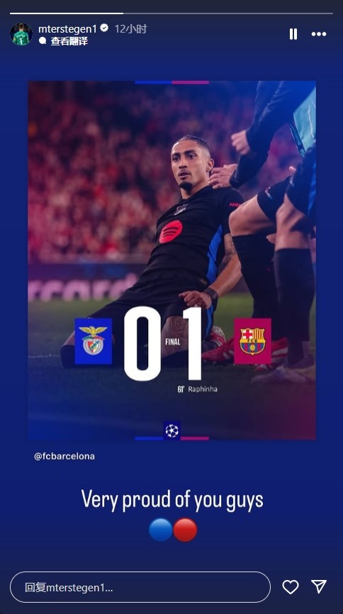 北京時間周四凌晨,巴薩客場1-0戰(zhàn)勝本菲卡,拉菲尼亞打進(jìn)制勝球。賽后,巴薩門將特爾施特根在個人社交媒體上曬出了本場比賽結(jié)果,并配文:“為你們而感到驕傲。”