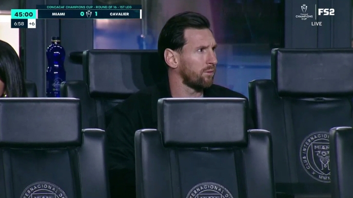 在上半場補時階段,客隊球員阿特金森破門,但是裁判觀看VAR后判定進球越位。邁阿密被進球時梅西在場邊愁容滿面,VAR檢查時梅西也是坐不住了站了起來。