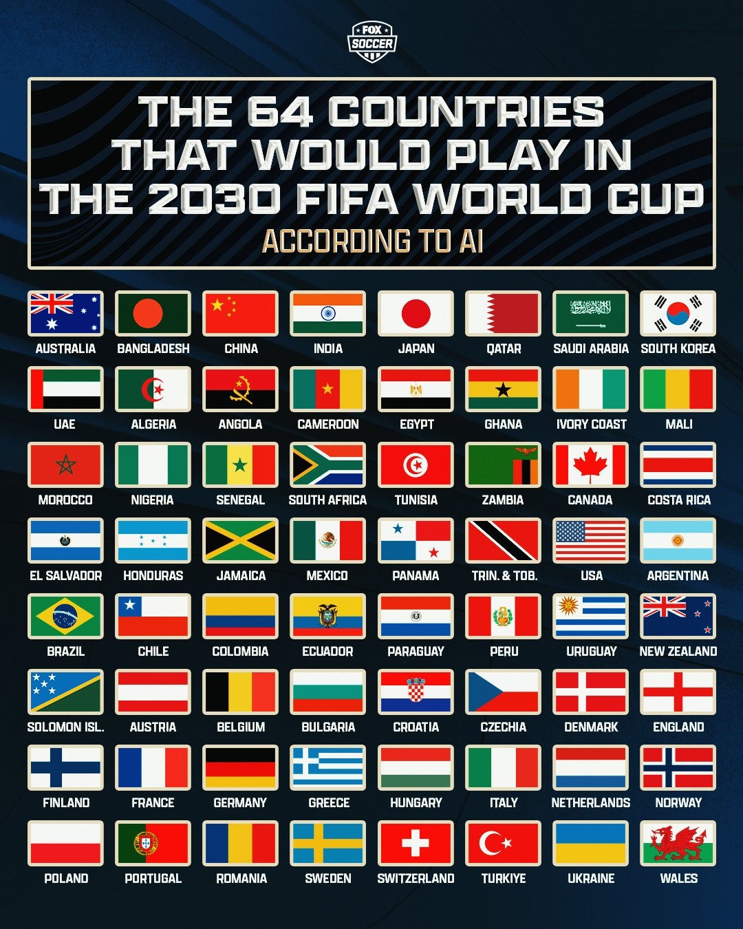 福克斯足球發(fā)文,表示要求ChatGPT列出如果2030世界杯擴(kuò)軍64支隊(duì)后所有的64個國家。同時福克斯寫道:你覺得這種形式是個好主意嗎?