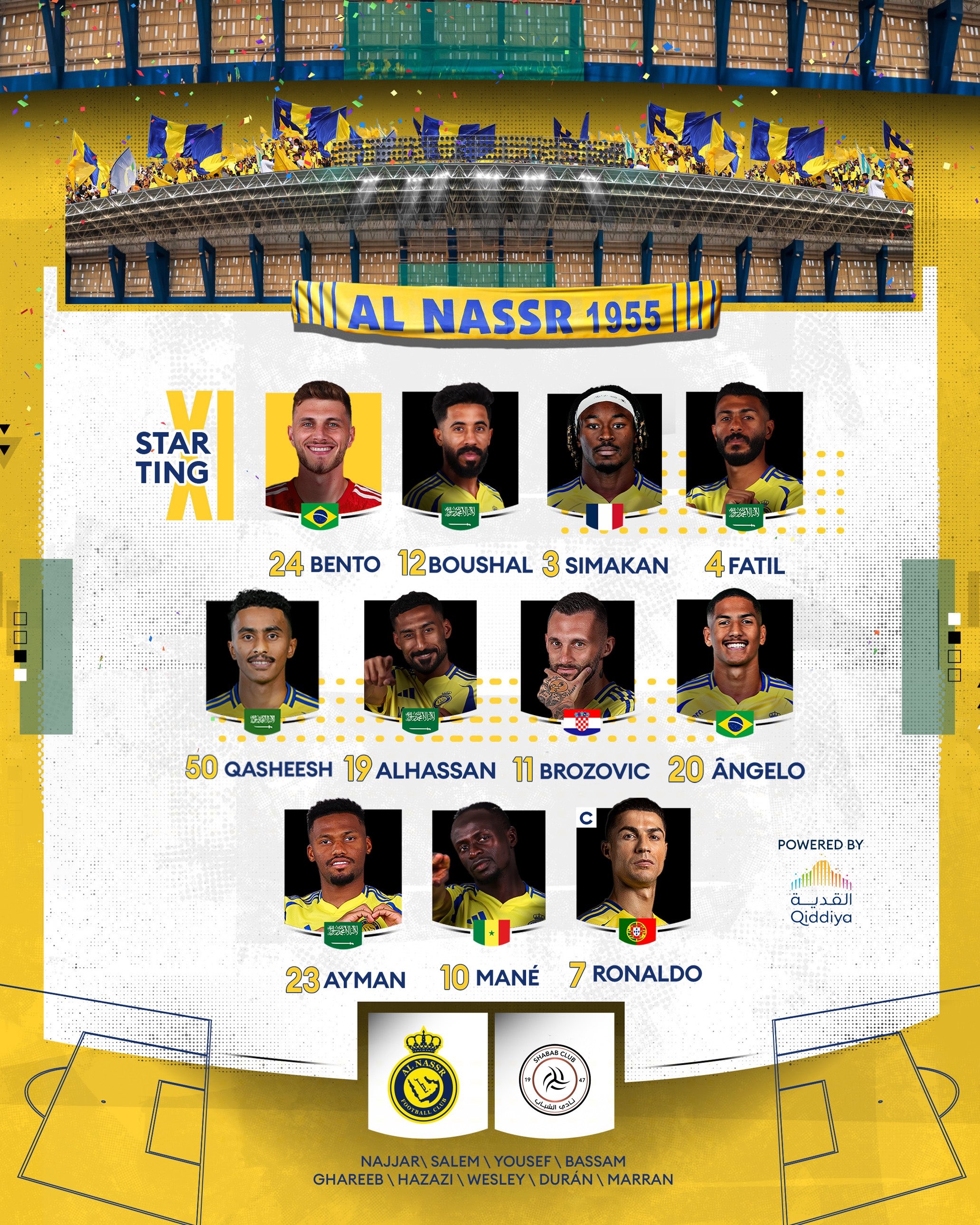 3月8日訊 沙特聯(lián)第24輪,利雅得勝利主場對(duì)陣?yán)诺们嗄耆?。賽前,官方公布了本場的首發(fā)名單。