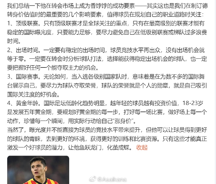 我之前寫了篇介紹胡桑諾夫的長(zhǎng)微博,提出了一個(gè)球員曝光度對(duì)于球員職業(yè)生涯和能力影響的問題。其實(shí)當(dāng)時(shí)有很大程度上是寫給準(zhǔn)備迎接各級(jí)大賽的各年齡段國(guó)足,尤其是當(dāng)時(shí)正在備戰(zhàn)亞青賽的國(guó)青隊(duì)員和家長(zhǎng)們看的。很巧,我看到賽后有很多人也都在為國(guó)青球員們失去了在世界球探面前展現(xiàn)自己的機(jī)會(huì)而惋惜不已。一個(gè)有才華的球員,只有在足夠的曝光度下,才能從被忽視的角落走向舞臺(tái)的中央,迎接屬于自己的機(jī)遇與挑戰(zhàn)。只有當(dāng)他站在更廣闊的平臺(tái)上,才能借助更強(qiáng)大的資源,迅速提升自我,釋放潛力,達(dá)到職業(yè)巔峰。但是真的很可惜,可惜到我已經(jīng)不想去回想下午那場(chǎng)球了。